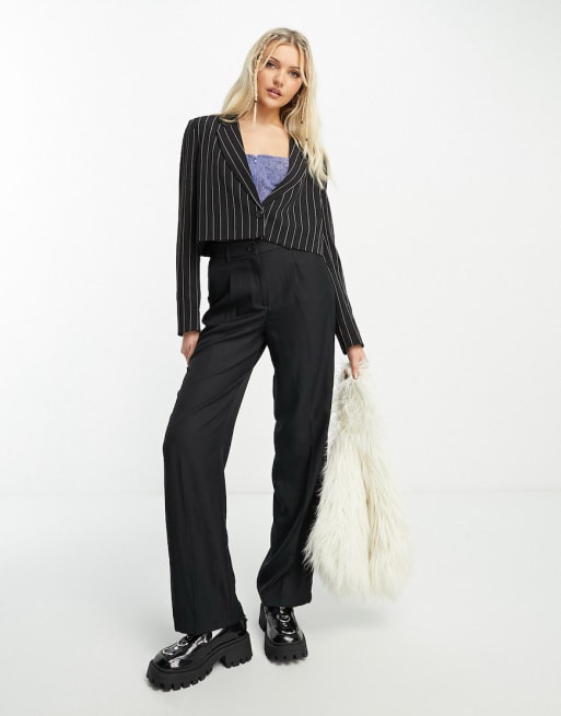 Noisy May mini skirt, cropped blazer & tailored pants set in black pinstripe