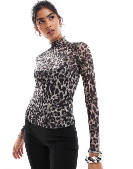 Object long sleeve mesh roll neck top in leopard print
