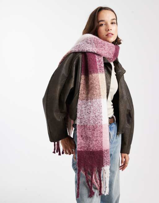 Object super soft large chunky tassle scarf in burgundy and pink check