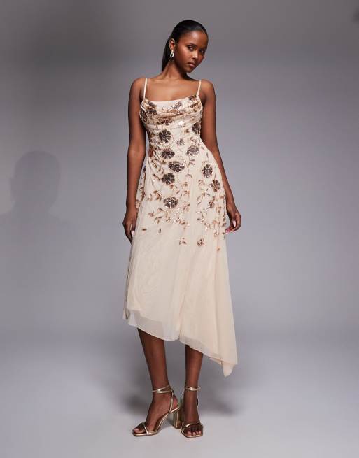 Oh Polly floral embellished asymmetric midaxi dress in gold