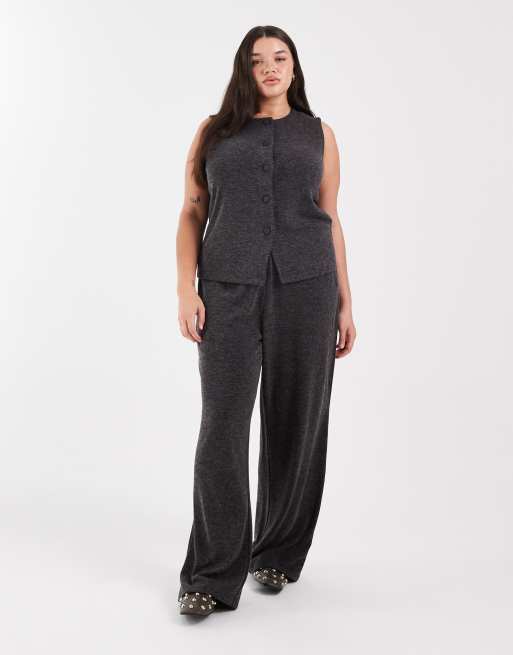 ONLY Curve light knit waistcoat & wide leg pants set in dark grey