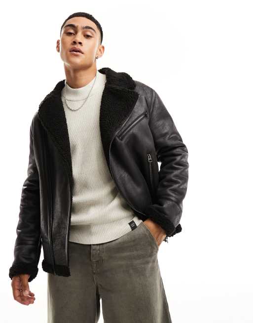 Only & Sons faux leather aviator coat with borg lining in black