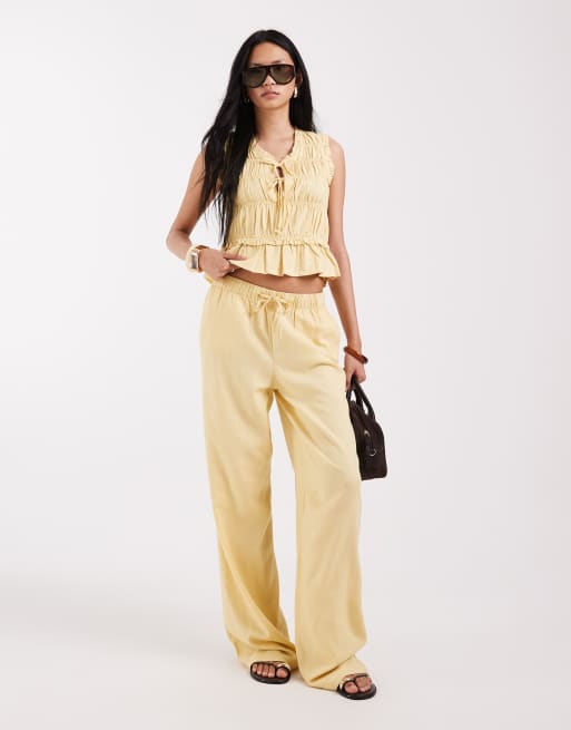 ONLY Tall linen blend tie front ruched top & pull on pants set in pale yellow