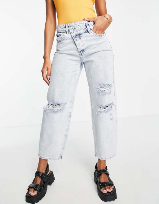 Only Juliet low rise asymmetric button ripped boyfriend jeans in light blue