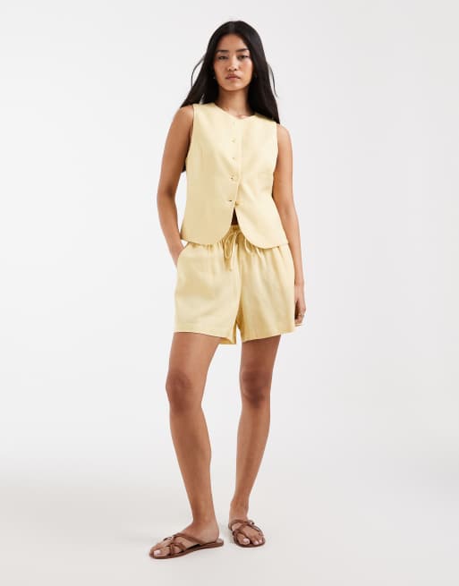 ONLY linen blend tailored waistcoat, pull on pants & shorts set in pale yellow