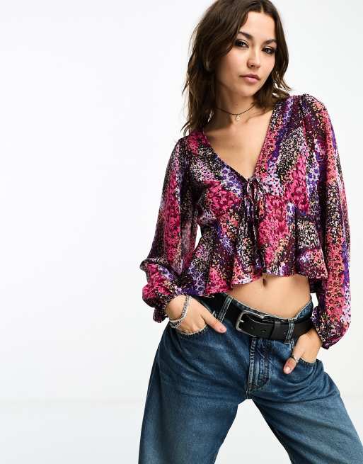 Only tie front blouse in multi patchwork floral