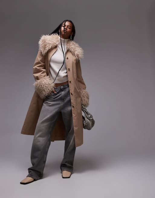 & Other Stories belted midi coat in dark beige with detachable faux fur collar and cuffs