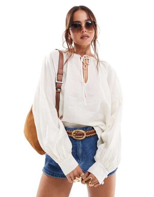 & Other Stories textured blouse with volume sleeves and bow tie neck detail in off white