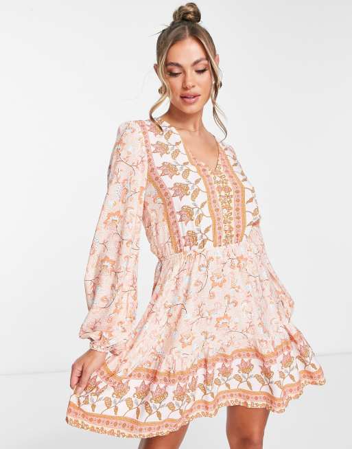 Parisian button through mini dress with border print