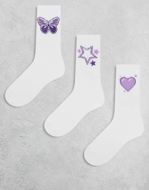 PIECES 3 pack of purple embroidered ankle socks in white