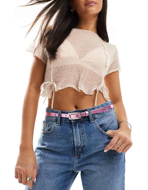 Pieces leather look slim belt with retangular buckle in pink