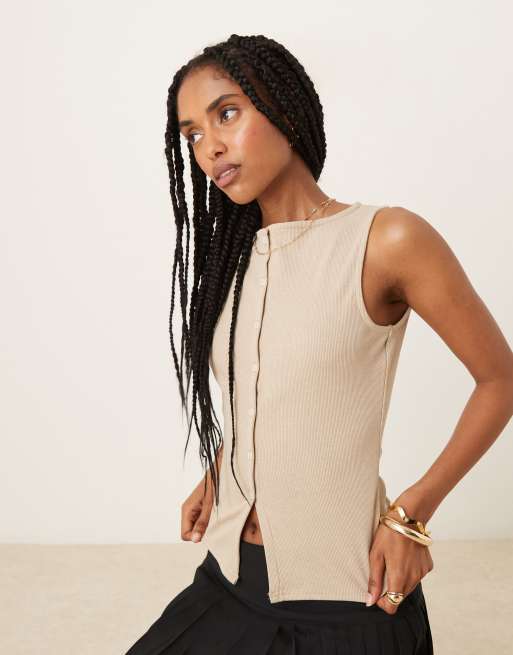 Pimkie ribbed sleeveless button-down split front waistcoat top in beige