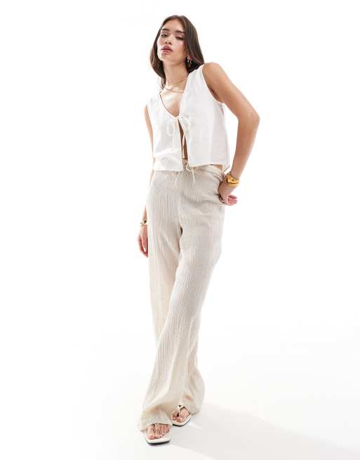 Pimkie textured linen blend drawstring wide leg pants in beige
