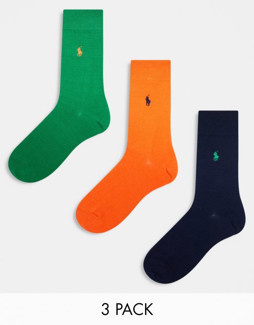 Polo Ralph Lauren 3 pack mercerised cotton socks with logo in orange green navy