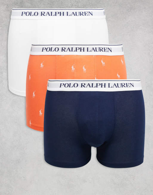Polo Ralph Lauren 3 pack of white logo waistband plain & all-over icon classic trunks in orange/white/navy