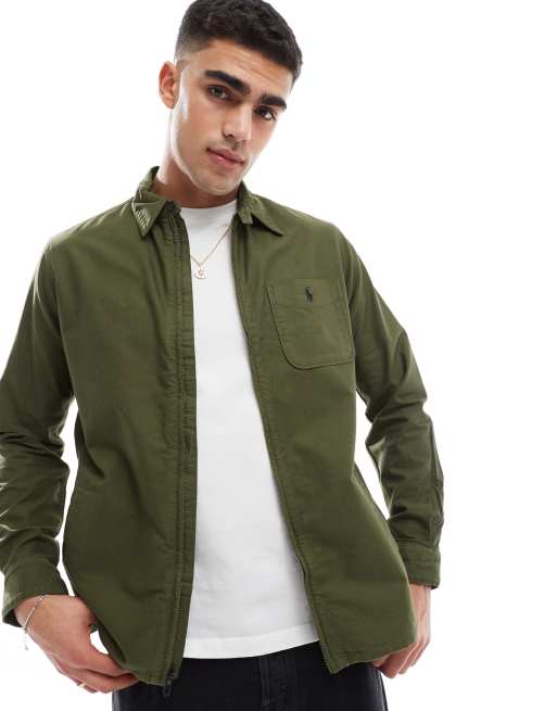 Polo Ralph Lauren icon logo pocket zip front garment dyed oxford overshirt in dark green