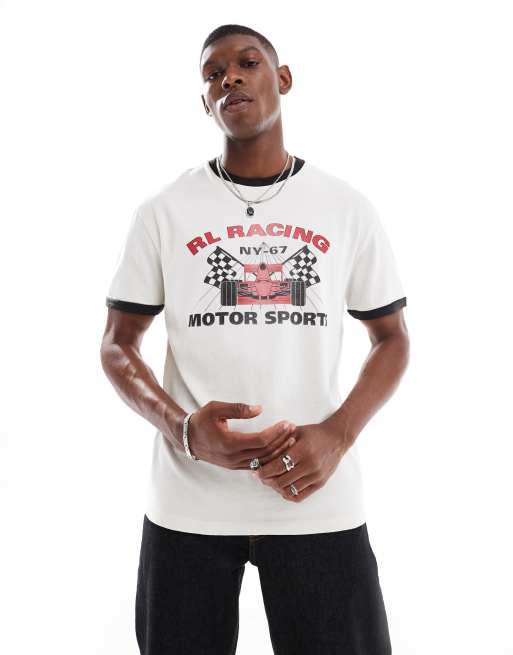 Polo Ralph Lauren racing logo print classic oversized fit ringer t-shirt in off white