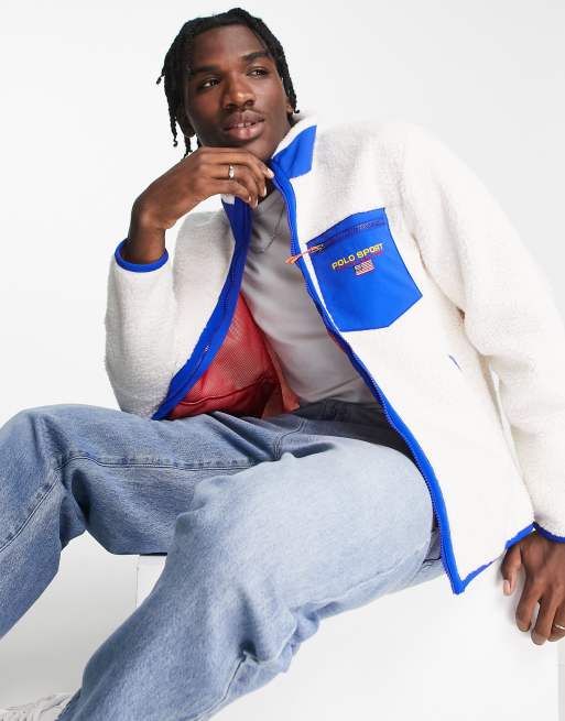 Polo Ralph Lauren Sport capsule logo borg full zip sweatshirt in cream/blue