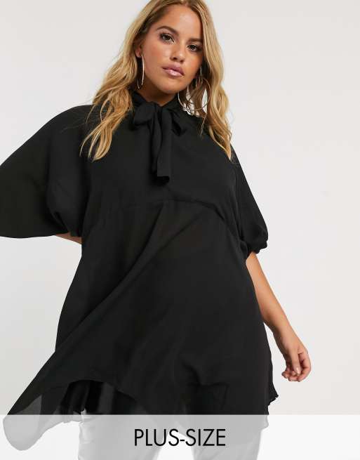 PrettyLittleThing Plus floaty tunic dress with tie neck in black