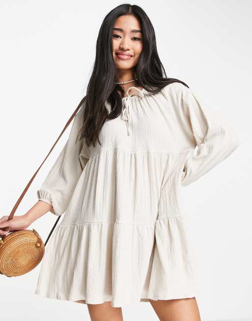 Pull&Bear cotton tiered long sleeve mini smock dress in natural
