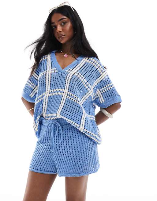 Pull&Bear crochet knitted polo top and shorts set in blue check