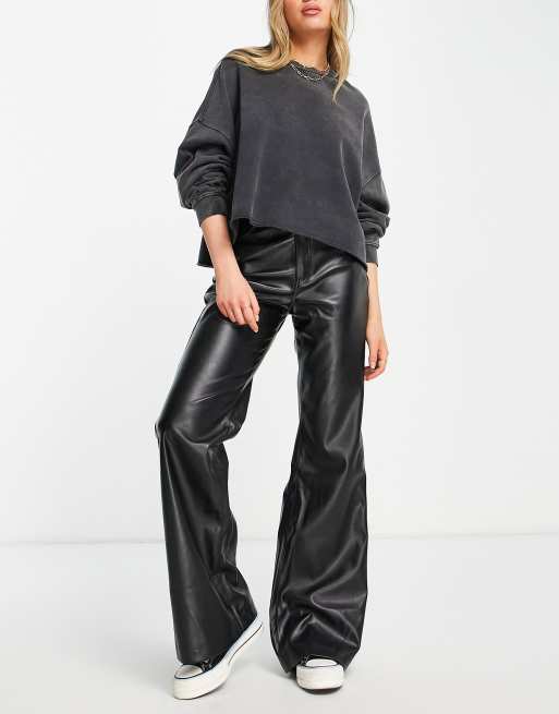 Pull&Bear faux-leather wide leg pants in black