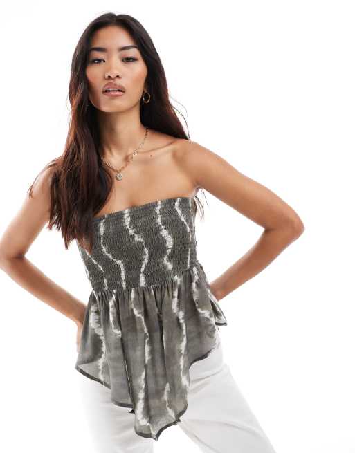 Pull&Bear shirred bandeau scarf hem top in khaki tie dye (part of a set)