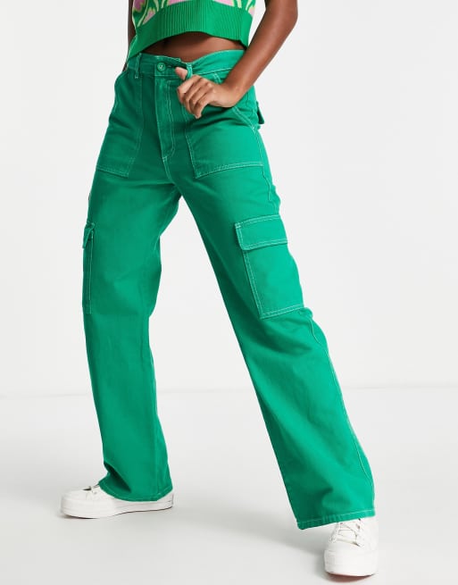 Pull&Bear straight leg cargo pants with contrast stitch in green