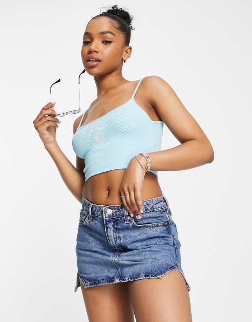 Pull&Bear strappy embroidered graphic cropped singlet in blue