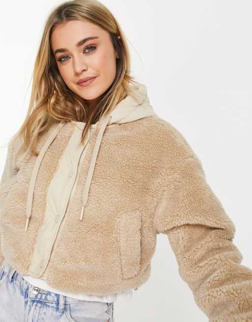 Pull&Bear teddy bomber jacket with quilted hood mix in ecru