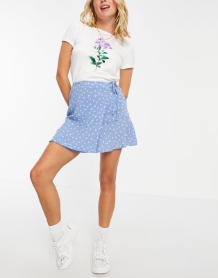 Pull&Bear wrap mini skirt with frill detail in blue polka dot