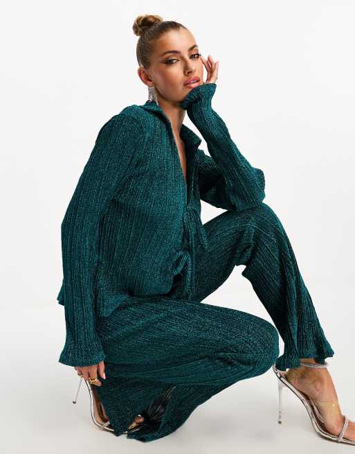 QED London long sleeve plisse shirt with tie front in teal (part of a set)
