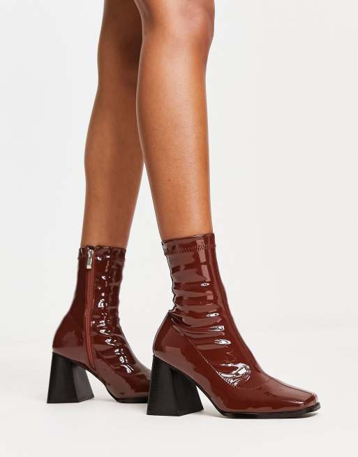 RAID Clever mid heel sock boots in chocolate patent