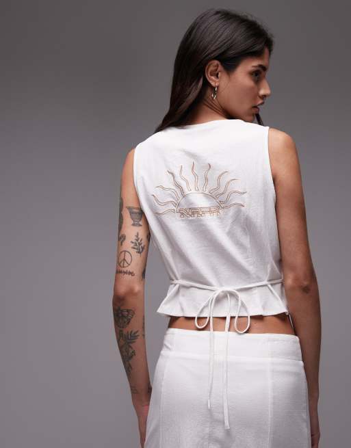 Resume button up crop waistcoat top with back graphic in white (part of a set)
