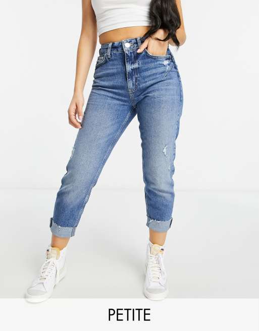 River Island Petite Carrie comfort sculpt raw hem mom jeans in mid authentic blue