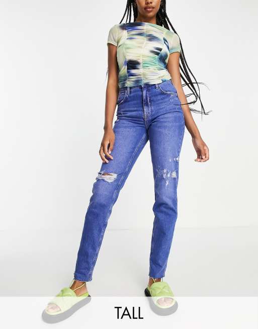 River Island Tall high rise slim mom jeans with rips in bright blue