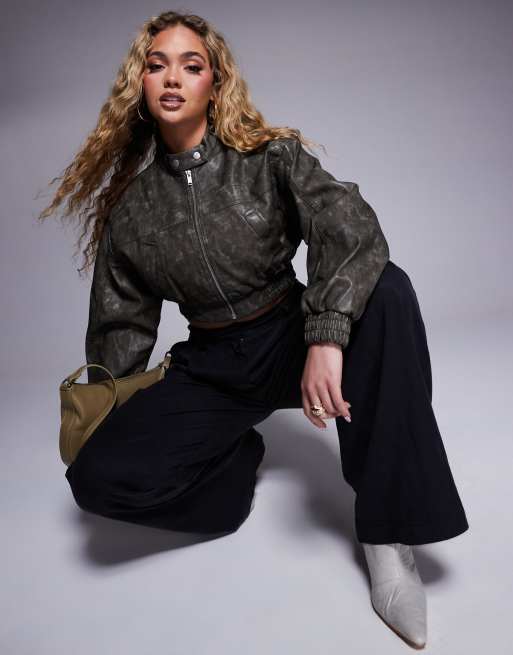 River Island faux leather crop bomber jacket in dark grey