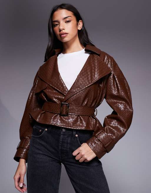 River Island faux leather woven belted crop trench in light brown
