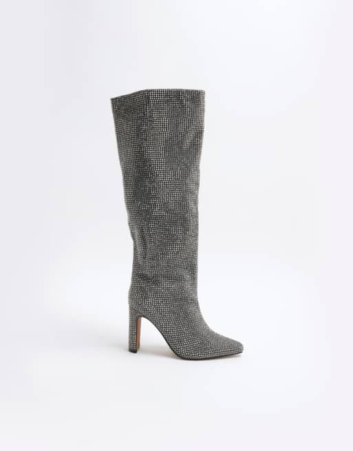 River Island heatseal knee high heeled boots in pewter