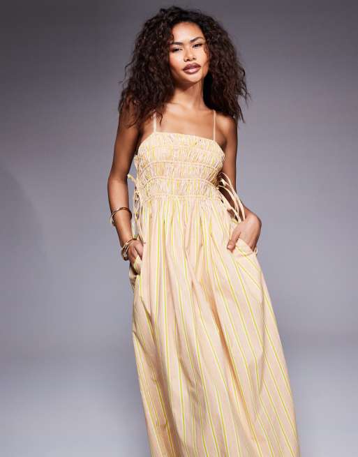 River Island shirred strappy midi dress in stone