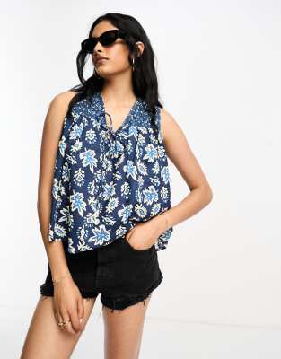 River Island shirred tie front ruffle blouse in blue floral (part of a set)