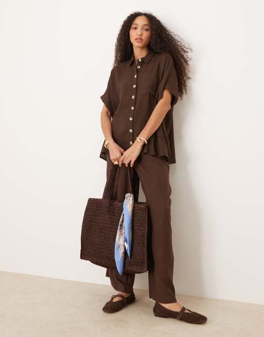 River Island tie sleeve detail linen look shirt in brown