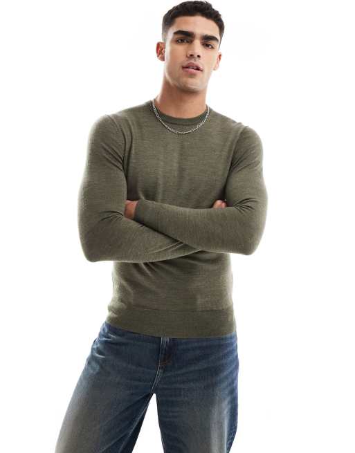Scalpers classic round neck tricot jumper in olive