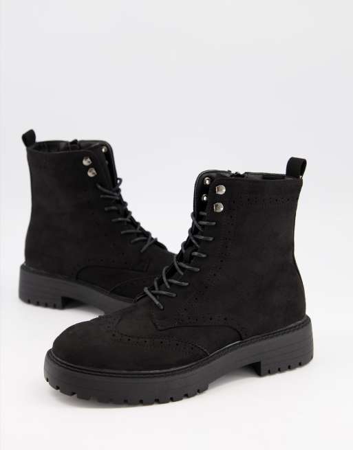 Schuh Anabelle lace up flat boots with brogue detail in black suedette