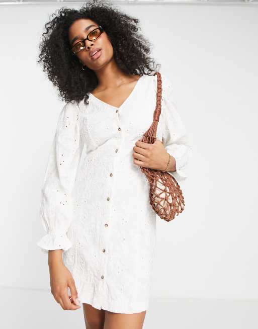 Selected Femme broderie mini dress with button front in white