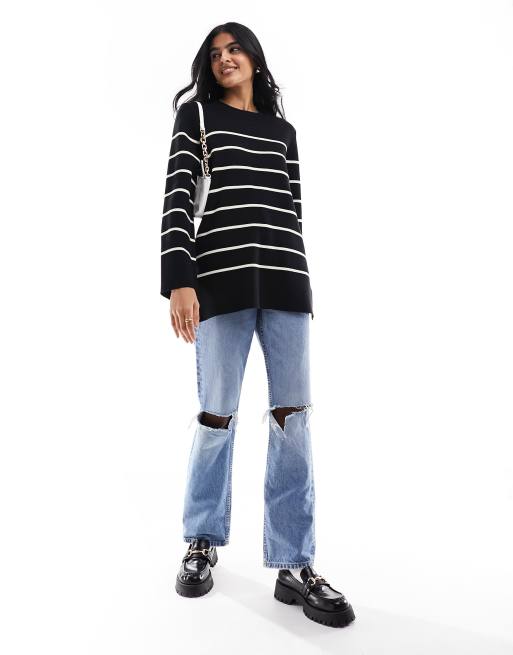 Selected Femme crew neck longline knitted jumper in black with white stripes