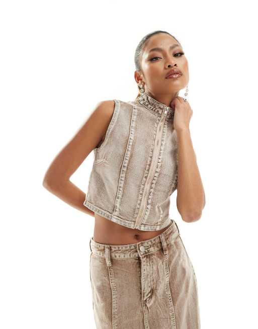 Simmi denim high neck zip through sleeveless top in light wash sand (part of a set)