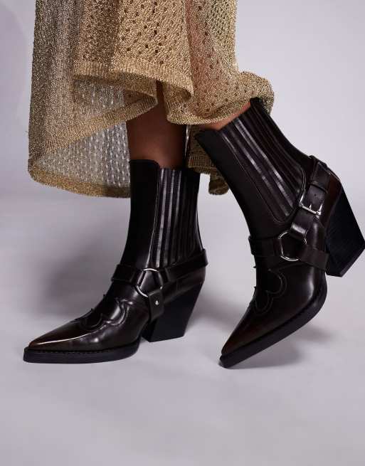 Simmi London Esperanza mid ankle cowboy boots with buckle detail in brown PU