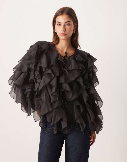 Dream Sister Jane tie front ruffle blouse in black