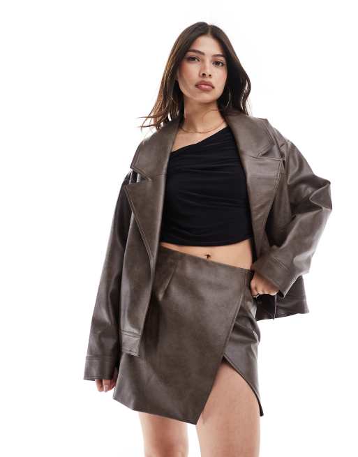 SNDYS leather look oversized collar jacket and wrap buckle side mini skirt set in washed brown